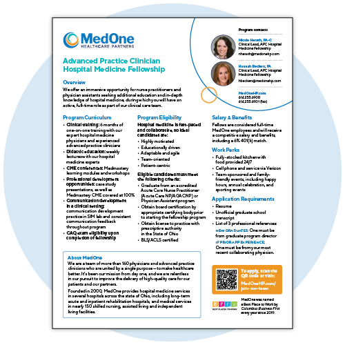 Fellows are considered full-time MedOne employees and will receive a competitive salary and benefits, including a 6% 401(k) match.